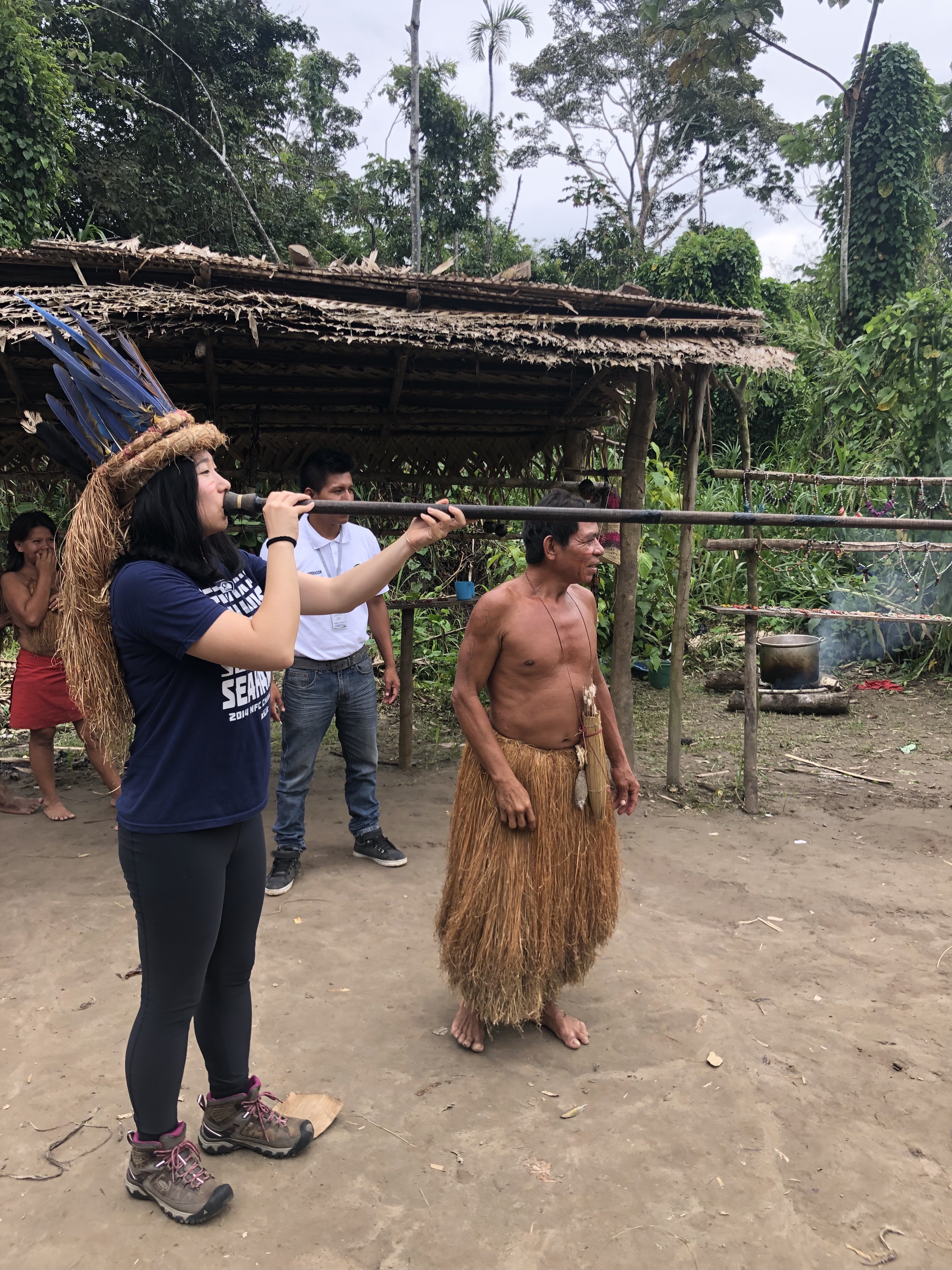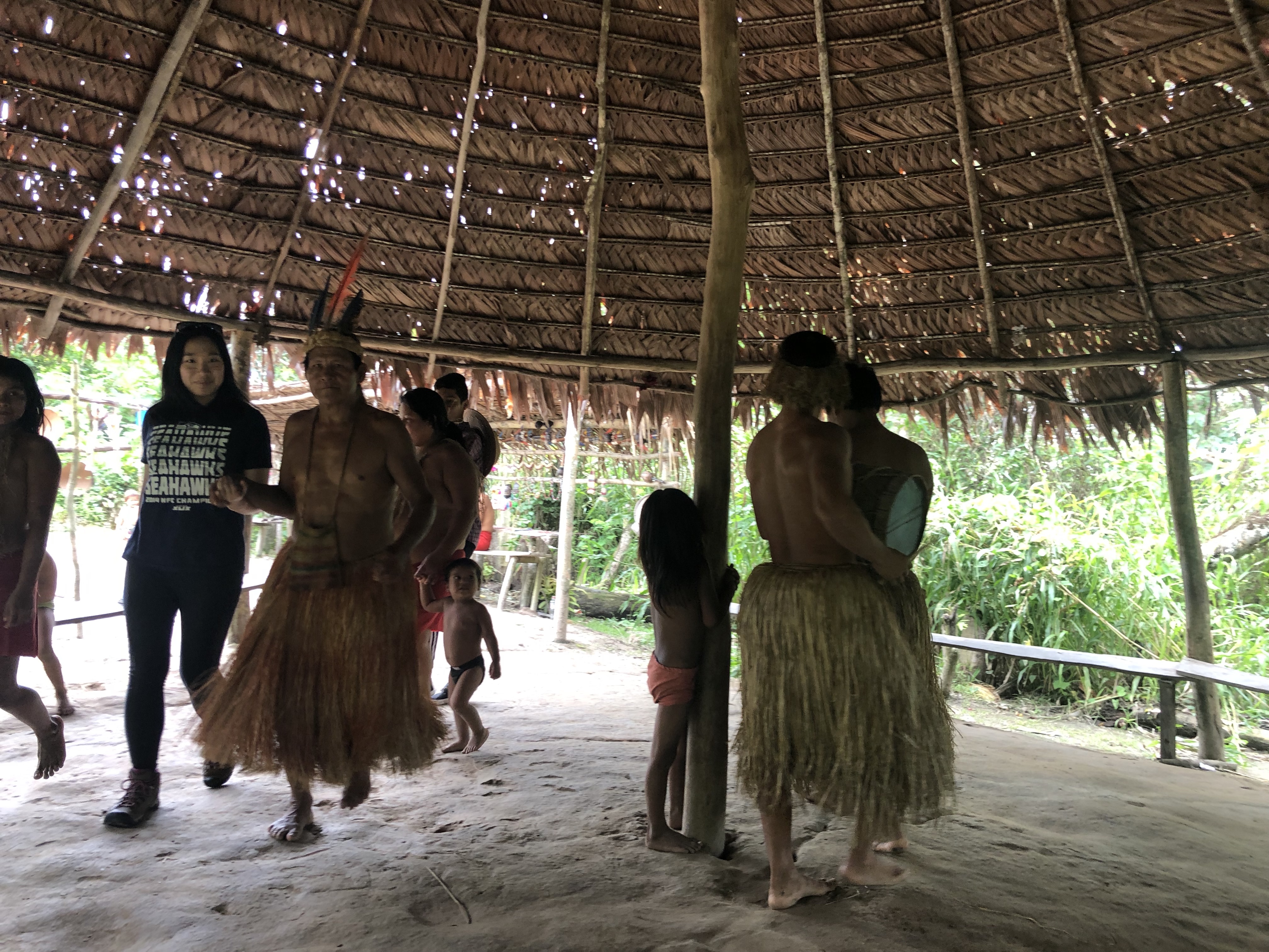 Our first stop after 2 hours boat riding is an Indigenous Amazonian Tribe. The indigenous people inhabit a large portion of the Amazon rainforest, and they still practice their culture beliefs and traditions from centuries ago. They live in the rainforest and feed on the forest animals and plants. They also only speak indigenous language. They used their traditional ways to welcome us for the visit, which includes face painting and tribal dance. We also learned a lot about their culture during our short visit.